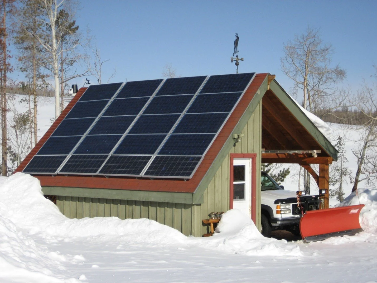 The clients lived in an off-grid situation for 11 years in comfort and style. There were some problems, mostly due to fossil fuel generator. The PV system may have been undersized at 4 KW and most problems would have been solved with a larger PV system or the addition of a wind turbine. They had a windy site. However, at that time PV panels were expensive and now financial incentives existed that would have helped keep the system price down. Economically speaking, running a fossil fuel generator 5 – 10 hrs a week made sense. Today, because appliances are more efficient and PV costs are low, we tend to over design our RE systems so reliance on a fossil fuel backup is reduced. One of many lessons learned.